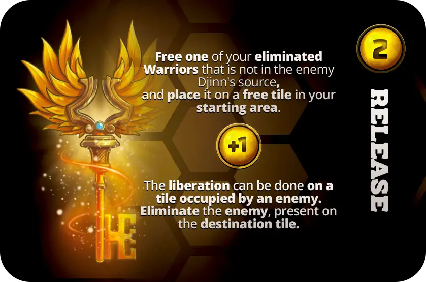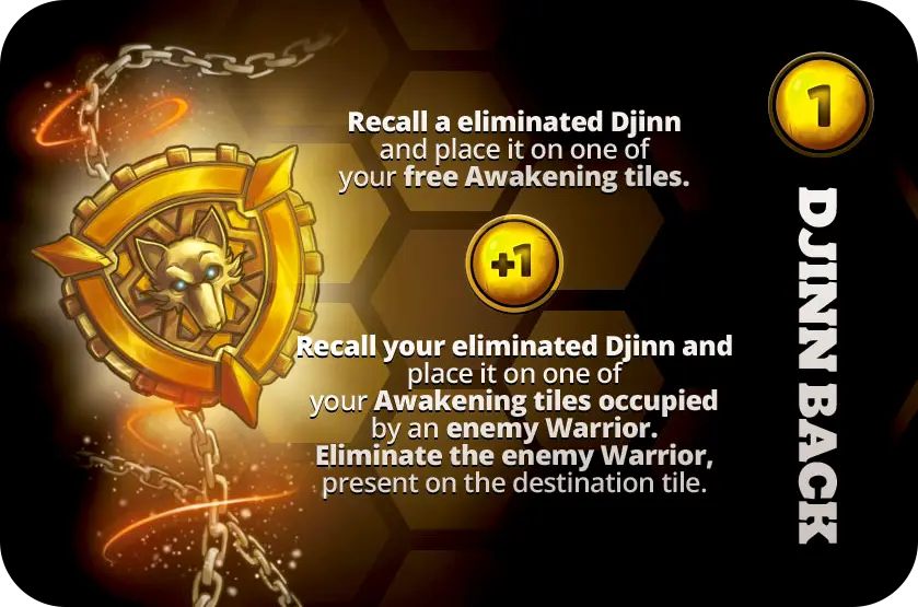 Stratégie : Les Djinns sont des forces implacables qui avancent vers l’Akrios ennemi. Leur invocation représente un tournant majeur dans la partie, forçant l’adversaire à réagir rapidement sous peine de voir son Akrios capturé.